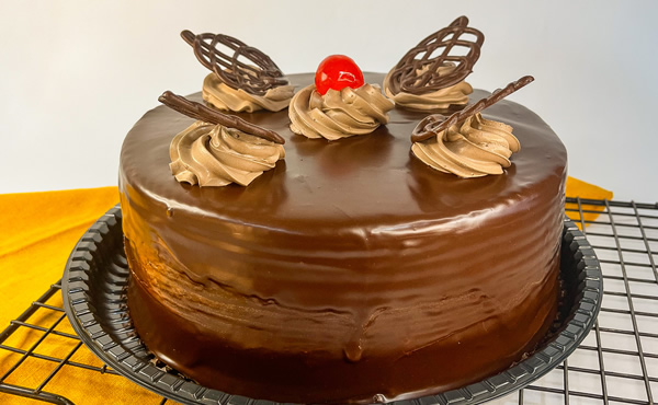 Massa pão de ló de chocolate, umedecido com calda, com recheio trufado, coberto com chantilly e calda de chocolate, além de grades de chocolate nas laterais.