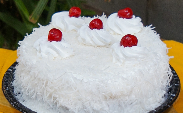Massa pão de ló, umedecido com calda, recheado com coco e beijinho. Decoração: Chantilly branco na cobertura e laterais, coberto com coco ralado na cobertura e nas laterais.
