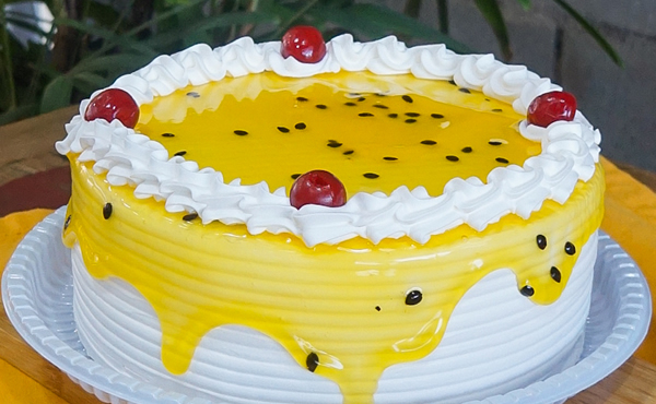 MARACUJÁ. Massa pão de ló, umedecido com calda, recheado com mousse de maracujá. Decoração: Chantilly branco na cobertura e laterais e sementes de maracujá com brilho em cima para decorar.