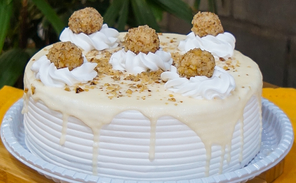 NOZES. Massa pão de ló, umedecido com calda, recheado com leite condensado e nozes cozidas. Decoração: Chantilly branco na cobertura e laterais, coberto com xerém nas laterais e nozes em cima para decorar.