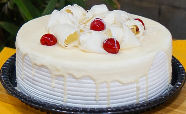 MOUSSE DE CHOCOLATE BRANCO. Massa de pão de ló branca, umedecido com calda, recheada com mousse de chocolate branco. Decoração: Chantilly na cobertura e laterais, cobertura com raspas de chocolate branco e cerejas para decorar.