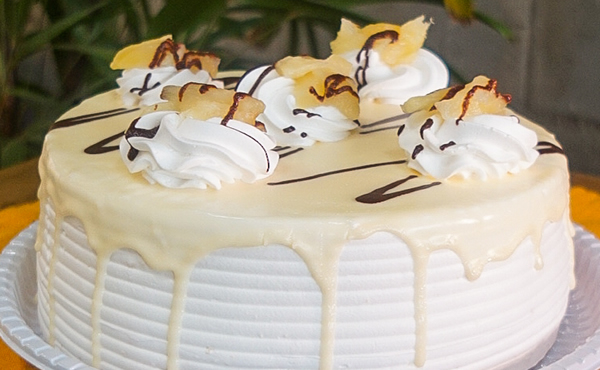 Massa pão de ló, umedecido com calda, recheado com creme e abacaxi. Decoração: Chantilly branco com calda, coberto com xerém nas laterais e pedaços de abacaxi em cima para decorar.